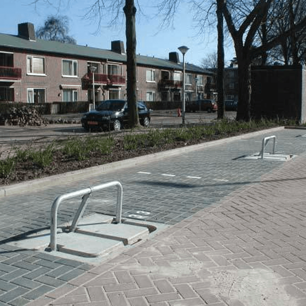 Een stevige parkeerbeugel, volledig verzonken in een betonplaat van circa 275kg. Hierdoor ligt de parkeerbeugel ingeklapt gelijk met het straatwerk. Deze parkeerbeugel is één van de stevigste oplossingen om foutparkeerders te ontmoedigen.